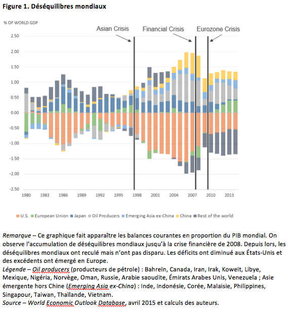 Dans deux articles publiés en 2008, nous montrions que les « déséquilibres mondiaux » de la fin des années 1990 et du début des années 2000 (Figure 1) résultaient principalement de la capacité inégale des différents pays à produire des actifs sûrs, et de la discordance entre cette capacité et la demande locale pour ces actifs. Nous notions en particulier que les Etats-Unis étaient le principal producteur d’actifs sûrs, quand la Chine, les pays producteurs de pétrole (surtout au Moyen-Orient) et le Japon étaient les principales sources de la demande pour ces mêmes actifs. Pendant plus de deux décennies, une pénurie grandissante d’actifs sûrs au niveau mondial a contribué à faire baisser fortement et durablement les taux d’intérêt mondiaux. Les flux de capitaux ont servi de mécanisme de propagation : les régions affectées par une pénurie d’actifs sûrs ont tiré vers le bas les taux d’intérêts des régions qui en produisaient.
