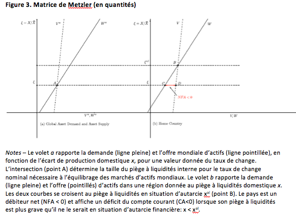 Nous caractérisons les déséquilibres mondiaux au moyen d’une matrice de Metzler (en quantités) qui relie la taille du piège à liquidités mondial et les positions nettes d’actifs étrangers (et de compte courant) à la taille des pièges à liquidités qui apparaîtraient dans chaque région dans une situation d’autarcie financière (Figure 3). Ceci est analogue à l’analyse traditionnelle, où les taux d’intérêt réels d’équilibre au niveau mondial et les positions nettes d’actifs étrangers (et de compte courant) sont connectés aux taux d’intérêts réels d’équilibre qui prévaudraient dans chaque région si elle se trouvait en situation d’autarcie. Cette analyse montre que lorsque le piège à liquidités d’une région en autarcie est plus grave que le piège à liquidités mondial, ce pays est aussi un créditeur net et affiche des excédents courants dans un environnement financier intégré – en d’autres termes qu’il exporte efficacement son piège à liquidités vers l’étranger. Toutes choses égales par ailleurs, un pays connaît un piège à liquidités plus sévère que la moyenne lorsque sa capacité à produire des actifs financiers est faible par rapport à sa propre demande pour ces actifs. Pour la même raison, dans ce contexte, un grand pays souffrant d’une grave pénurie d’actifs sûrs peut tirer l’économie mondiale dans un piège à liquidités mondial, par le biais de sa pression à la baisse sur les taux d’intérêt d’équilibre au niveau mondial.