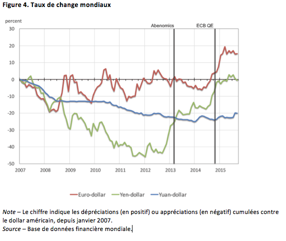 Par conséquent, notre analyse apporte une contribution aux débats entourant la guerre des changes. Les dépréciations récentes de taux de change récents et dans la zone euro s’inscrivent bien dans ce mécanisme, tel qu’illustré à la Figure 4, tout comme les planchers atteints par le franc suisse au plus fort de la crise européenne et ce qui a suivi. En outre, le récent ralentissement chinois est conforme à une pénurie structurelle d’actifs sûrs dans un pays dont la monnaie est factuellement « indexée » à un dollar en hausse.