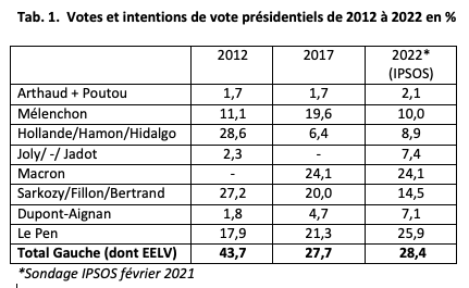 Cette dispersion de l’électorat socialiste est-elle définitive ? Le tableau 1 montre que, selon le sondage Ipsos d’intentions de vote présidentiel de 2022, paru en février 2021, le total gauche se maintient autour de 28%, avec simplement des transferts entre Jean-Luc Mélenchon et Yannick Jadot, qui s’expliquent par le fait qu’il n’y avait pas de candidat écologiste en 2017. Même si un sondage d’intentions de vote, si éloigné de la date du scrutin, mesure le rapport de forces de l’échéance passée plutôt que celui de la future échéance, on est en droit de se demander si les candidats de gauche pourront réussir, dans le climat politique actuel, à reconquérir les 16 points perdus entre 2012 et 2017.