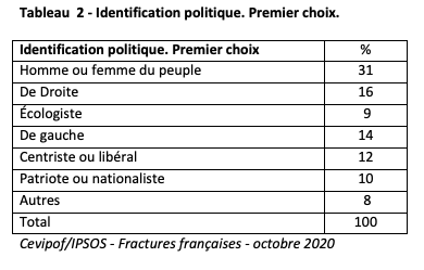 L’affaiblissement du clivage gauche-droite est constaté dans de nombreuses études. Un récent sondage de l’IFOP (février 2021) montre à quel point les Français ont acté cet affaiblissement. Prés des deux-tiers des personnes interrogées estiment que « l’opposition entre la gauche et la droite est dépassée ». 28% estiment que cette opposition « a encore un sens mais n’est pas un clivage dominant » et seulement 8% estiment qu’elle continue de jouer un rôle déterminant. Cet affaiblissement est confirmé par le sondage Cevipof/IPSOS d’octobre 2020 sur les fractures françaises. Invitées à choisir une identification politique parmi une liste présentée, 30% des personnes interrogées seulement se classent à droite (16%) ou à gauche (14%) (tableau 2). 31% préfèrent s’identifier comme « hommes ou femmes du peuple », refusant donc une identité clairement politique, et 39% choisissent une autre identification.