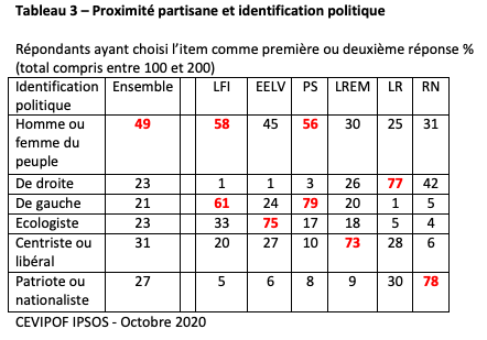 Globalement 44% choisissent en premier ou en deuxième choix de se situer sur l’axe gauche-droite alors que 49% préfèrent s’identifier comme « hommes ou femmes du peuple », ce qui suggère un clivage vertical peuple-élite, plutôt qu’horizontal gauche-droite. Chaque groupe de sympathisants d’un parti politique choisit une identification politique spécifique à l’exception du groupe LFI et du groupe PS qui opèrent des choix semblables, s’identifiant de gauche ou comme hommes ou femmes du peuple. Les proches d’EELV s’identifient comme écologistes, les proches de LREM s’identifient surtout comme centristes ou libéraux, les proches de LR s’identifient de droite et les proches du RN s’identifient comme patriotes ou nationalistes.