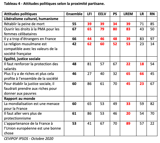Sur le premier groupe d’attitudes, libéralisme culturel et humanisme, le clivage politique oppose les proches de LFI, EELV, PS et LREM aux proches de LR et du RN.
