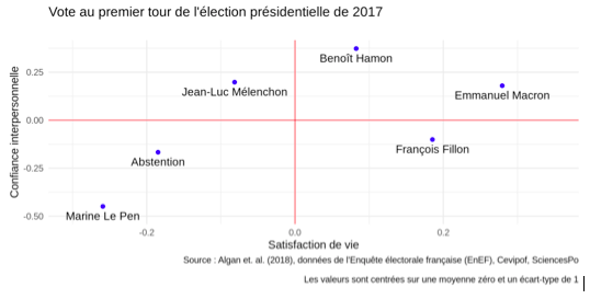 Alors que les électorats de Marine Le Pen et de Jean-Luc Mélenchon ont des niveaux de revenus similaires, on constate un polarisation sur la confiance interpersonnelle. Les électorats de Jean-Luc Mélenchon et de François Fillon ont des niveaux de diplômes similaires, mais divergent fortement sur le sentiment de satisfaction à l’égard de sa propre vie. Une semblable divergence sépare les deux électorats de gauche, insoumis et socialiste. Et bien sûr, la diagonale des contraires oppose les électorats Le Pen et Macron, avec un électorat d’extrême droite qui cumule l’insatisfaction à l’égard de sa propre vie et la défiance à l’égard d’autrui.