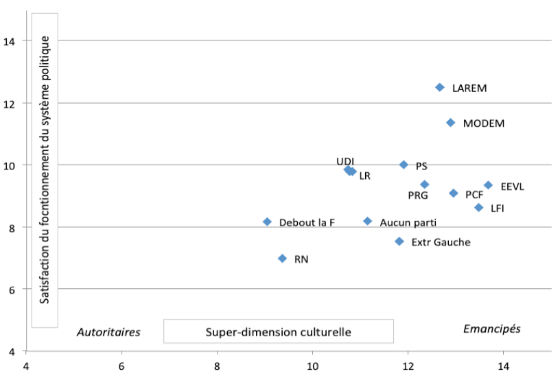 Lecture : La position de chaque point est définie par le score de ses sympathisants : sur la super-dimension culturelle en abscisse ; sur l’échelle de satisfaction du fonctionnement du système politique. Les deux échelles sont standardisées de 0 à 20. Ainsi pour les personnes proches du RN le score de 9,35 sur la super-dimension, les rapproche du pôle autoritaire et de 7 pour la satisfaction politique traduit leur fort mécontentement. Les scores de LREM (12,66 et 12,53) traduisent des valeurs et des opinions opposées. Ceux de LFI (13,46 et 8,64) expriment à la fois leur ouverture culturelle et leur mécontentement politique.