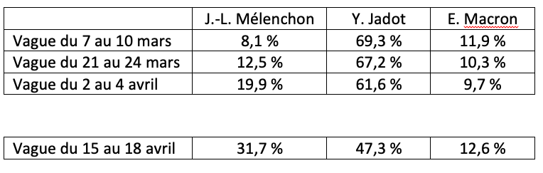 Le Tableau 1 montre que la minorité de 8% des sympathisants d’EELV qui s’apprêtait à un vote dissident en faveur de Jean-Luc Mélenchon au début du mois de mars a crû jusqu’à représenter environ 20% à la veille de l’élection. Une évolution de dernière heure aboutit au final à une évasion de près du tiers des sympathisants d’EELV dont moins de la moitié demeure fidèle à leur parti selon les données de l’enquête post-électorale Cevipof Le Monde. Pour les sympathisants d’EELV, l’attrait de la candidature de Jean-Luc Mélenchon a donc été fatal pour le vote en faveur de Yannick Jadot. On a parlé à juste titre d’un vote « utile » ou d’un vote « efficace », c’est certainement bien le cas ici. À mesure que les sondages annonçaient un score potentiel croissant à Jean-Luc Mélenchon, des proches d’EELV ont abandonné leur fidélité au parti de l’écologie politique pour la reporter sinon sur le gagnant potentiel du moins sur celui qui rendait le plus visible possible le poids d’une gauche prenant en compte les enjeux environnementaux. Car c’est bien ici que se situait le dilemme pour les Verts. Les faibles scores de la France insoumise aussi bien aux européennes de 2019 (6,3%) qu’aux élections locales qui ont suivi avaient masqué le fait que le parti de Jean-Luc Mélenchon était en réalité le premier et seul concurrent sérieux des Verts. Dès l’élection présidentielle de 2017, Jean-Luc Mélenchon avait intégré dans son programme une préoccupation bien argumentée pour les enjeux écologiques. Et lors de la campagne de 2022, les associations environnementales qui avaient publiquement évalué les programmes environnementaux des différents candidats plaçaient au premier rang à égalité le programme environnemental des Insoumis et celui des Verts.