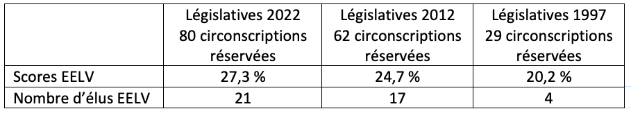 Tableau 2. Scores en % de suffrages exprimés d’EELV (Les Verts en 1997) dans les circonscriptions réservées en 1997, 2012 et 2022.