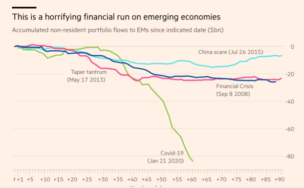 - Le vrai grand sujet est celui des inégalités que la crise révèle au grand jour et qu’elle va peut-être aggraver. C’est vrai dans nos sociétés nationales où on voit bien comment se manifeste et se durcit le partage entre ceux qui disposent de ressources pour « voir venir », comme on dit, ceux qui ont des filets de protections divers, ceux qui peuvent travailler à distance, et les autres, les précaires, les migrants, les SDF[9], etc. Comme beaucoup d’observateurs l’ont noté, la crise révèle ce que sont les métiers essentiels, et rappelle que ce sont souvent les plus mal payés. La dimension inégalitaire est plus marquée encore à l’échelle internationale. Dans les pays pauvres et émergents, les dégâts sanitaires risquent d’être beaucoup plus graves que chez nous, mais aussi les dégâts économiques. Martin Wolf a publié dans le Financial times un graphique terrifiant où on voit à quelle vitesse s’opère le rapatriement des capitaux depuis les pays émergents (sans comparaison avec ce que l’on a vu en 2018)[10]. Et le président éthiopien a rappelé dans le même journal combien une Afrique durablement envahie par le virus serait dangereuse pour l’Europe et le monde[11]. Alors que le repli national est le réflexe, compréhensible, la coopération internationale la plus large est la seule réponse pertinente. En Europe et dans le monde.