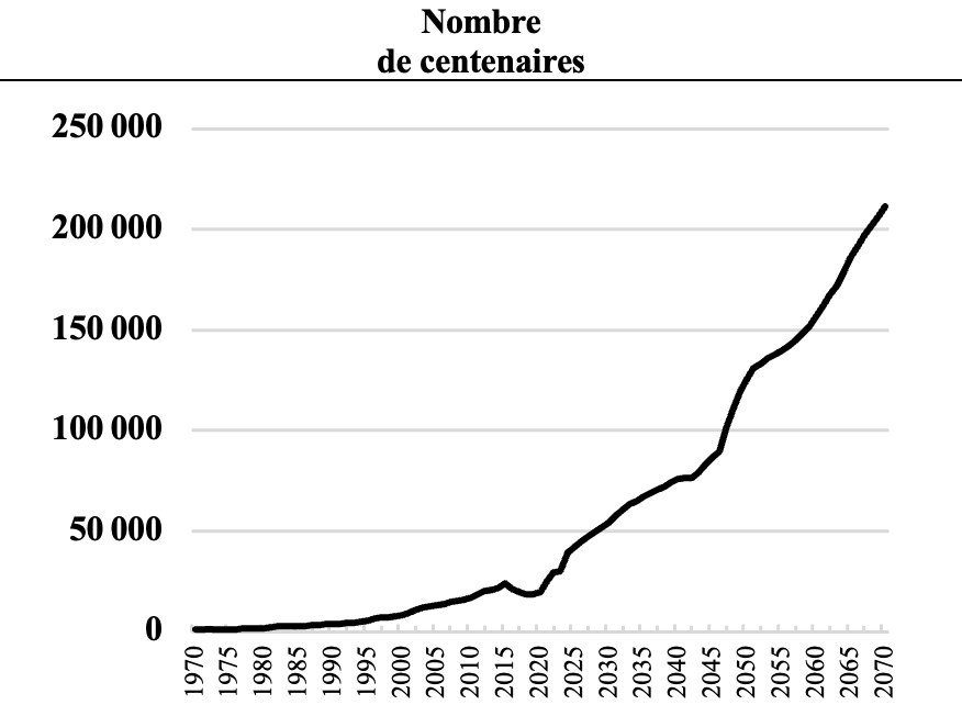 Parmi les moteurs du vieillissement de la population, en parallèle avec la progression de l’espérance de vie, une baisse de la fécondité contribue à un déséquilibre croissant, marqué par une proportion grandissante des personnes âgées. Un aspect singulier du vieillissement se situe dans le nombre de centenaires. Ils étaient, en France, un millier au début des années 1970. Ils sont 30 000 au début des années 2020. Selon le scénario central des projections démographiques de l’INSEE ils pourraient être plus de 200 000 en 2070, représentant alors, tout de même, 0,3 % de la population. En un demi-siècle leur nombre a été multiplié par 30. Dans le demi-siècle qui vient, ce nombre pourrait être multiplié par 7[2].