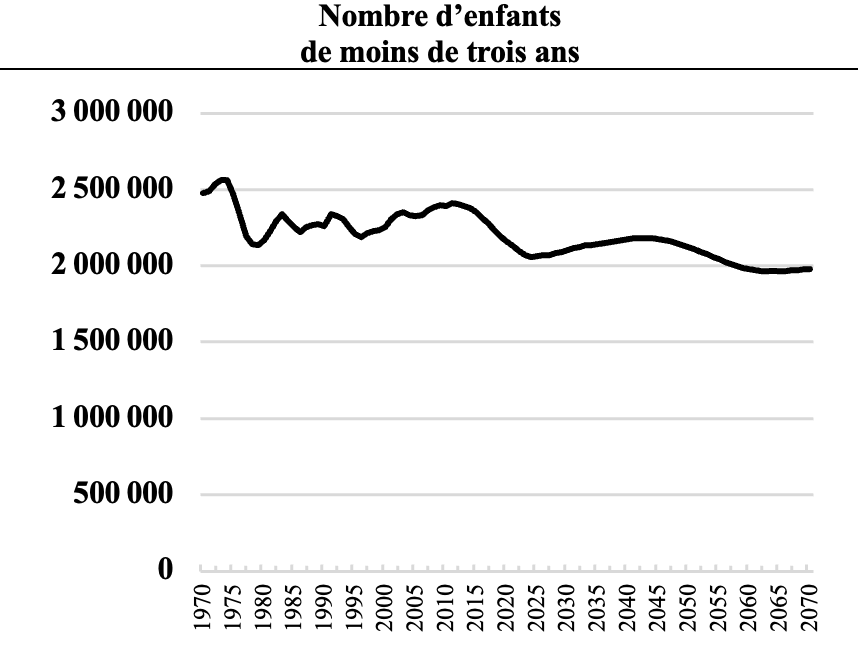Si les projections du nombre de personnes âgées prêtent assurément à la discussion technique, en fonction d’hypothèses sur l’espérance de vie et les migrations, celles concernant les petits enfants prêtent à des débats plus fournis, tout simplement car les degrés d’incertitude sont plus élevés (les personnes âgées de demain et d’après-demain sont nées, à la différence des bébés qui ne sont pas encore arrivées. Cette précision à l’esprit, notons que, en 1970, les enfants de moins de trois ans étaient 2,5 millions. Au début des années 2010, ils étaient encore 2,4 millions. À l’horizon 2070 ils devraient être moins de 2 millions. D’autres scénarios sont établis par l’INSEE, mais l’image centrale est claire.