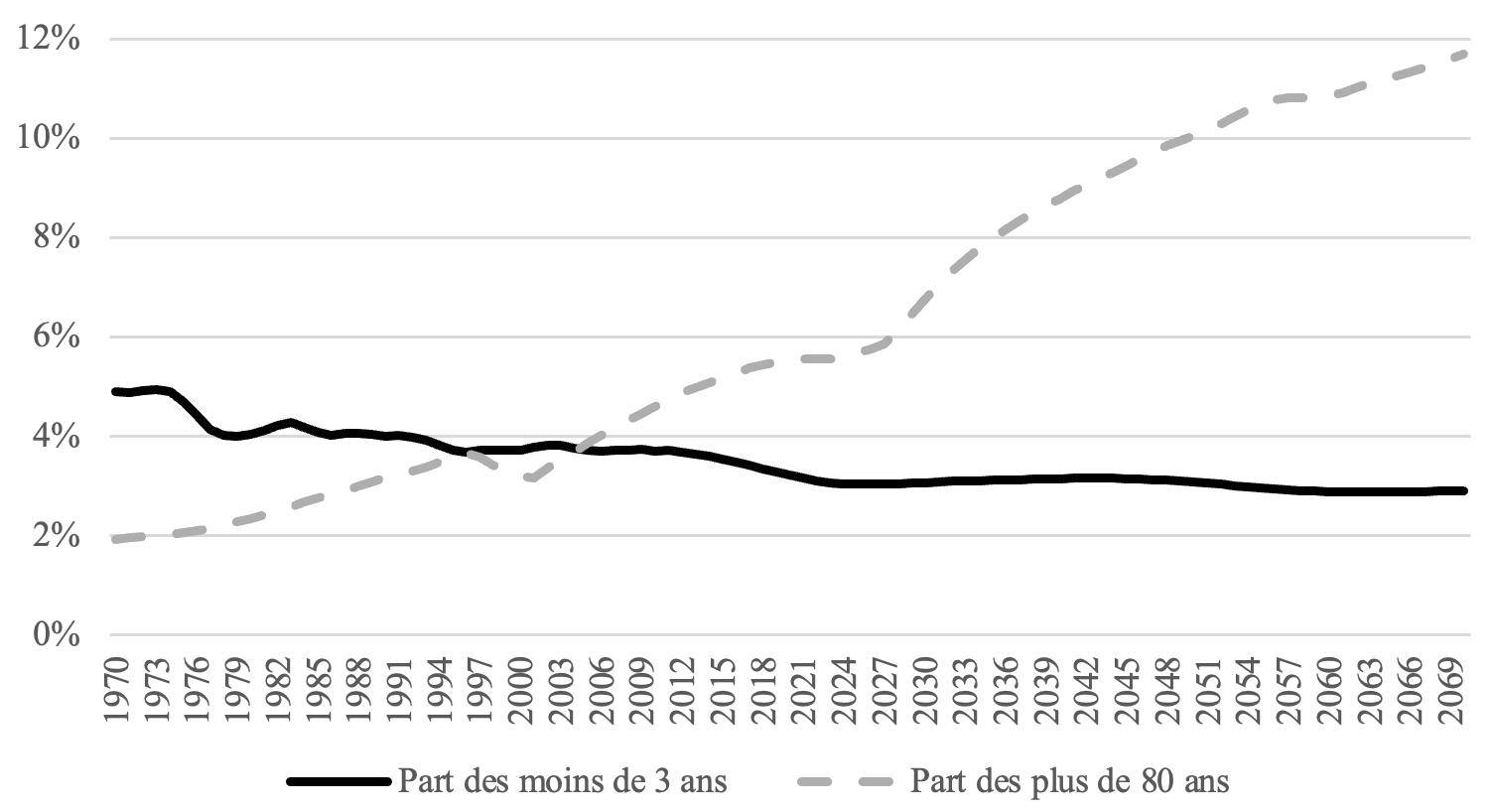 Pour bien montrer, en un unique graphique, toute la vigueur et toute la robustesse de la dynamique à l’œuvre, une représentation saisissante rapporte les proportions respectives, sur le même laps de temps (1970-2070), des plus jeunes (les moins de trois ans), aux plus âgés (les plus de 80 ans). Au début des années 1970, quand naissait la politique publique d’accueil de la petite enfance (les moins de trois ans donc), la cible de cette politique balbutiante représentait 5% de la population française. Les octogénaires et leurs aînés comptaient pour 2% de la population. Durant la décennie 2000, ces deux sous-populations, jeune et âgée, représentaient chacune 4 % de l’ensemble des personnes vivant en France. À l’horizon 2070, les petits enfants pourraient ne plus représenter, selon le scénario central de l’INSEE, que 3% des Français, quand les plus de 80 ans devraient eux rassembler 12 % de la population totale.