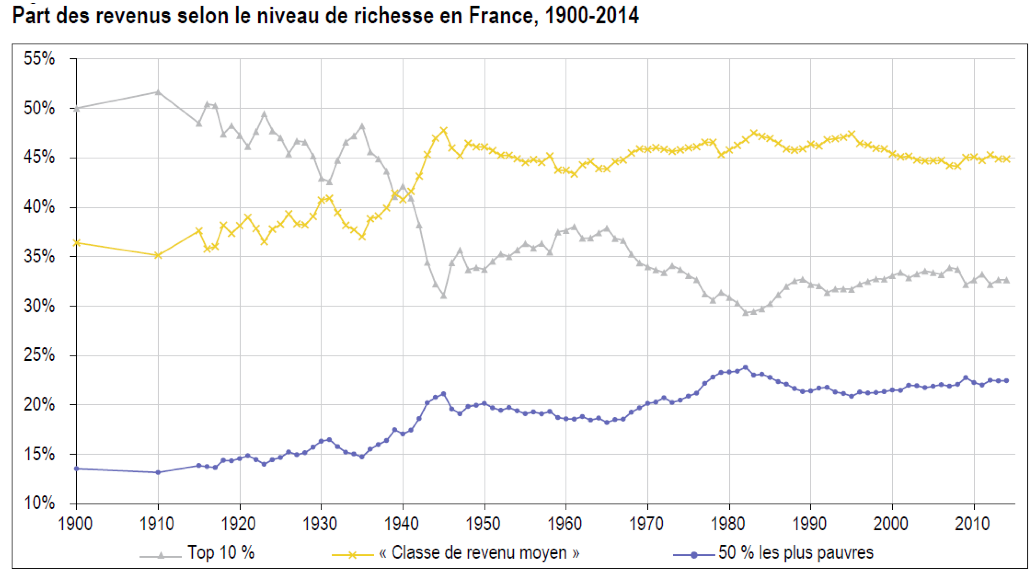 Le premier graphique concerne les 1% les plus riches. Il confirme effectivement qu’à partir des années 1980, la part du revenu total détenue par cette population s’est nettement accrue (tout en semblant se stabiliser au milieu de années 2000). Mais le graphique suivant qui compare la part des revenus détenues par les 10% les plus riches, les 50% les plus pauvres et ce que les auteurs appellent la « classe de revenu moyen » (définie comme les 40% dont le revenu se situe au-dessus des 50% les plus pauvres et en-dessous des 10% les plus riches), livre un tableau assez différent (que curieusement les auteurs de l’article ne commentent pas véritablement). Ce qui ressort principalement de la lecture de ce graphique, c’est une impression de grande stabilité. Certes, la part du top 10% s’accroît légèrement à partir du début des années 1980, mais sur le long terme la part du revenu détenue par les 50% les plus pauvres s’est nettement accrue, et la part de la classe du revenu moyen est remarquablement stable depuis les années 1950. La lecture qui ressort des données sur le 1% et des données sur les valeurs centrales de la distribution est donc assez différente. Dans le premier cas, on parlera d’une « hausse des très hauts revenus particulièrement prononcée entre 1983 et 2000 » (Garbinti et Goupille-Lebret) ; dans le second cas il faudrait parler tout au plus d’une légère remontée de l’inégalité (les 10%) qui n’affecte pas véritablement les revenus de la classe moyenne.