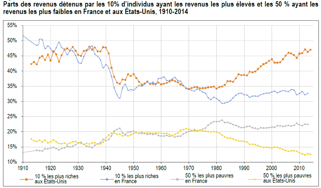 Bertrand Garbinti et Jonathan Goupille-Lebret produisent d’ailleurs à cet égard un graphique édifiant dans leur article, qui compare l’évolution des inégalités en France et aux Etats-Unis. Aux Etats-Unis, l’explosion des inégalités et l’appauvrissement de la classe moyenne sont patents. Rien de tel n’est discernable en France.