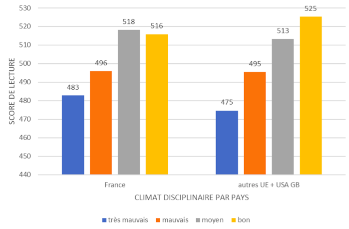 Lecture : les élèves français dont le score de climat disciplinaire est très mauvais ont un score de compréhension de l’écrit de 483 contre 516 pour ceux dont le score de climat disciplinaire est bon.