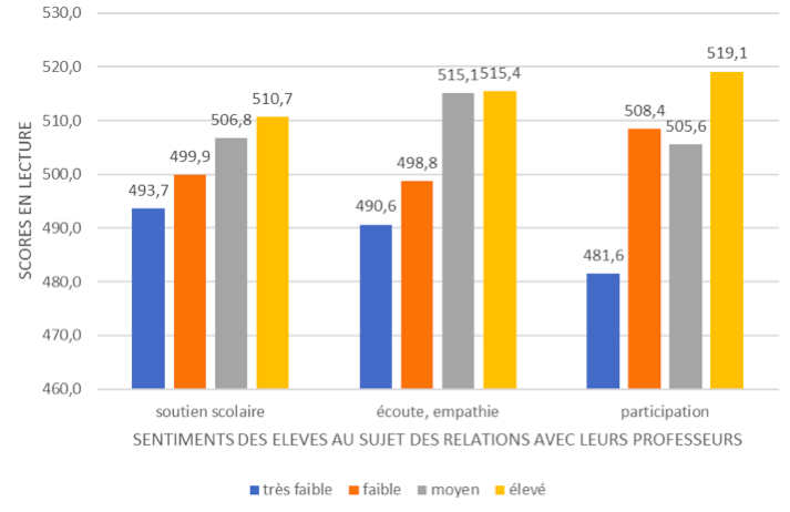 Figure 1. Scores en lecture en fonction des relations avec les professeurs (champ : UE26 + USA et GB)(source : PISA 2018)