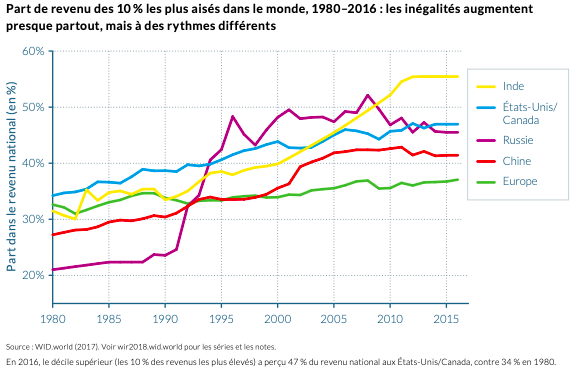 Il est donc intéressant de regarder ce qui s’est passé du côté de la distribution de ce revenu. Un organisme universitaire, piloté par des Français dont Thomas Piketty, publie tous les ans le Rapport sur les inégalités mondiales. Le dernier rapport contient la figure ci-dessous, qui montre la part du revenu national que reçoivent les 10% des ménages les plus aisés. On voit qu’en Europe, cette part a augmenté entre 1980 et 2016, mais beaucoup moins qu’ailleurs.