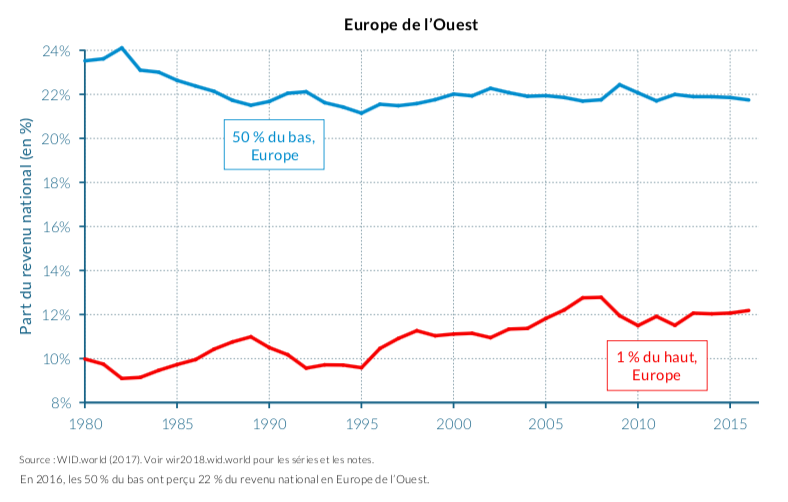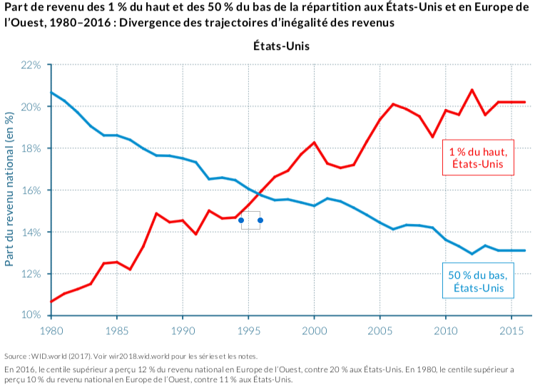 Le même rapport regarde de plus près ce qui s’est passé en Europe et aux États-Unis. La figure qui suit compare la part des revenus des très riches (les 1% des revenus les plus élevés) et celle des 50% les moins riches. Entre 1980 et 2016, en Europe, les plus riches ont capté 2% de plus du revenu national alors que la part des 50% les moins riches a reculé de 2%. Aux États-Unis, c’est un changement radical qui a eu lieu. Tout cela montre que les inégalités se sont aggravées, mais très légèrement en Europe. Dire que l’écart que l’écart est devenu « abyssal » est donc inexact.