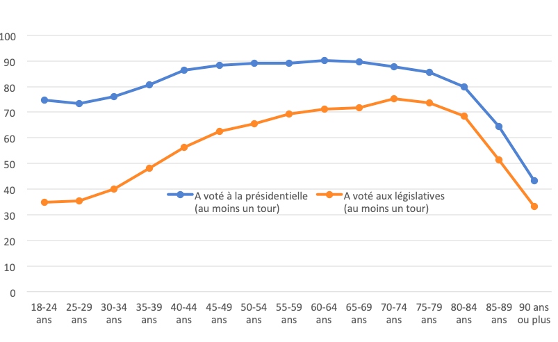 Lecture : 73,6% des 75-79 ans ont voté à au moins un tour des élections législatives, contre 34,8% des 18-24 ans.