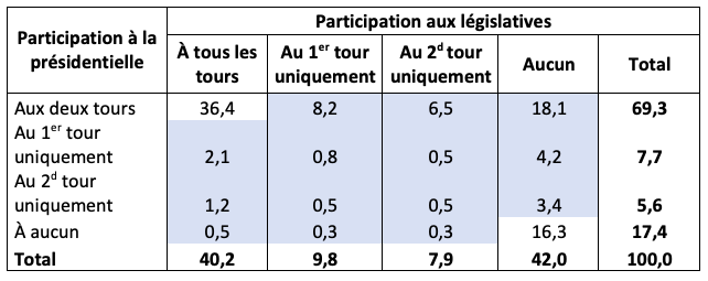 Lecture : 36,4% des inscrits ont voté à la fois aux deux tours de la présidentielle et aux deux tours des législatives. Parmi ceux qui ont voté au premier tour de la présidentielle mais se sont abstenus au second tour, 2,1% ont voté à tous les tours des législatives.