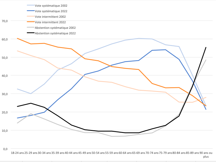 La seconde interprétation repose sur l’hypothèse d’un effet générationnel plus durable. Il y a indéniablement un effet du vieillissement dans l’évolution selon l’âge de l’abstention systématique, comme le montrent les courbes de 2002 et 2022 qui ont la même forme : décroissance jusqu’à 40-45 ans, stabilisation, puis remontée rapide après 75 ans. Mais rien n’assure que cet effet se reproduira à l’identique dans les générations récentes qui ont commencé leur vie politique avec un surcroît important d’abstention systématique. Celle-ci pourrait bien laisser des traces durables.