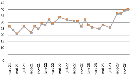 Graphique 1. Évolution de la popularité de Gabriel Attal (mars 2021 - décembre 2023)