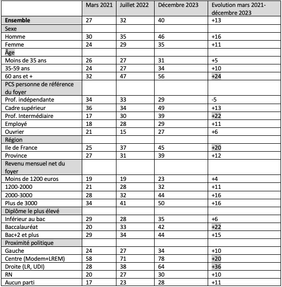 Pour l’instant le jeune ministre semble répondre en partie à ces inquiétudes en dégageant des perspectives fortes pour les calmer. Sa progression en termes de popularité est sensible dans tous les segments de l’électorat (tableau 1) mais son influence est particulièrement marquée chez les personnes âgées (56% chez les 60 ans et plus), les cadres supérieurs (49%), les habitants de l’Île de France (45%), les foyers aisés (50% dans les foyers où le revenu mensuel est de 3000 euros et plus), les électeurs proches du centre (78%) et de la droite (64%). Gabriel Attal garde donc un profil assez caractéristique de cette France qui va bien et qui est celle du macronisme. En revanche il reste plus faible chez les jeunes, dans les couches sociales modestes et chez les électeurs du RN. Sa dynamique sur la période 2021-2023 est impressionnante dans les tranches d’âge élevé (+24 points chez les 60 ans et plus), dans les couches moyennes (+22 points chez les professions intermédiaires, dans la région parisienne, parmi les diplômés du seul baccalauréat (+20 points) et chez les électeurs du centre (+20 points) et surtout de droite (+36 points). Une France moyenne et centrale, où l’inquiétude par rapport à la qualité de la formation est importante, participe beaucoup à la dynamique en faveur de Gabriel Attal.