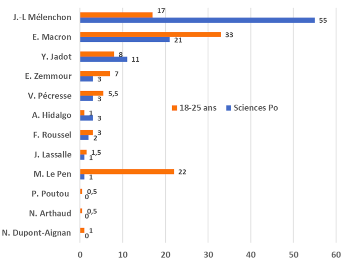 Figure 1. Vote au premier tour de la présidentielle de 2022 des étudiants de Sciences Po (% des suffrages exprimés) et des jeunes de 18-25 ans (intentions de vote)