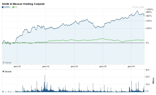 Ces succès commerciaux ne manquent pas de valoriser boursièrement les Masters of War, comme Bob Dylan les appelait dans une chanson étendard des années 60. Le graphique qui suit fait figurer, sur la période décembre 2012 à aujourd'hui, le cours de Smith and Wesson, un des grands fabricants d’armes d’assaut, coté au Nasdaq (Colt n’est pas coté et ne peut servir dans cette démonstration). Le graphique met en regard du cours de Smith and Wesson et celui de P&G (Procter and Gamble), qui vend des lessives et des parfums, un des chevaux de labour de la bourse de New-York. Sur les cinq ans passés, il valait clairement mieux investir dans les armes à feu que dans la lessive.
