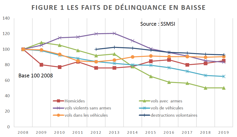 Les figures 1 et 2 montrent les évolutions des faits de délinquance enregistrés par la police et la gendarmerie. Les données sont présentées en base 100 en 2008 pour pouvoir comparer les évolutions de différents types d’actes délinquants, dont l’ampleur est évidemment très variable : il y a eu 880 homicides en 2019, mais plus de 1 200 000 faits de vols de différents types. Il faut aussi garder à l’esprit que ces données administratives ne reflètent pas toujours parfaitement, on le verra, l’évolution effective de la délinquance, du fait notamment que les faits en cause ne sont pas systématiquement signalés aux autorités. Néanmoins, ces données sont très instructives.