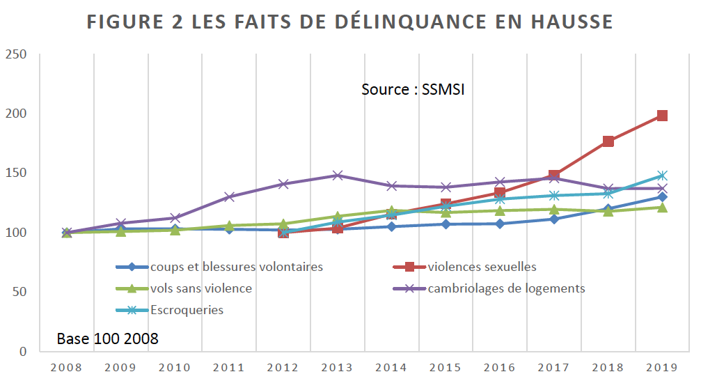 Parmi les faits de délinquance en hausse recensés dans la figure 2, on relève deux comportements violents : les violences sexuelles et les coups et blessures. La croissance des faits déclarés de victimes de violences sexuelles notamment est spectaculaire. Mais cette croissance des faits enregistrés ne correspond pas à une croissance de même ampleur des violences sexuelles effectivement perpétrées.