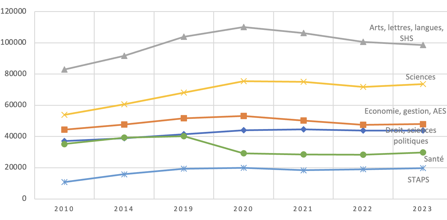 Les disciplines d’arts, lettres, langues et sciences humaines et sociales (SHS) sont celles qui attirent le plus de nouveaux étudiants au début de chaque année universitaire (voir figure 1) : environ 100 000 nouveaux inscrits à l’université en 2023, contre 74 000 scientifiques. Pourtant, du point de vue de la rentabilité du diplôme et de la satisfaction qu’il procure dans les emplois occupés à la suite des études, les étudiants de sciences sont bien mieux pourvus. Pour quelles raisons les lettres, sciences humaines et sociales continuent-elles pourtant d’être attractives ? Et l’attractivité des sciences peut-elle s’améliorer ?
