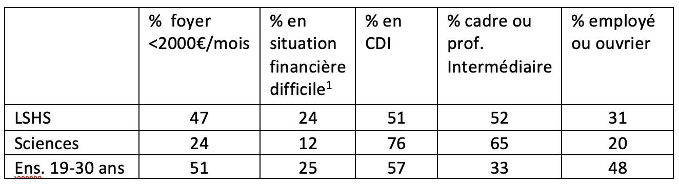 Indéniablement, les diplômés de LSHS occupent de moins bons emplois que les diplômés de sciences : ils vivent nettement plus souvent dans un foyer aux faibles ressources et se sentent donc deux fois plus souvent en situation financière difficile que les scientifiques ; ils sont moins souvent en CDI et occupent plus souvent un emploi d’employé ou d’ouvrier ce qui peut se comprendre comme un déclassement par rapport à leur niveau de diplôme.