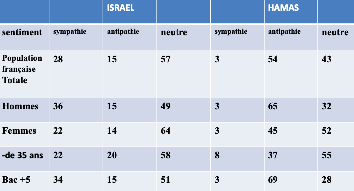 Ce sondage conduit à un moment où les passions étaient déjà bien présentes donne quelques pistes. Les Français dans leur majorité marquent une indécision sur quoi penser des parties en présence, sans doute parce que la complexité des enjeux implique une connaissance approfondie de l’histoire des relations entre Israéliens et Palestiniens et permet difficilement de prendre fait et cause catégoriquement et sans nuances pour l’une des parties. Il serait faux de dire que les Français sont engagés dans les passions du Moyen-Orient. 57% des sondés sont neutres ou se disent pas assez informés vis-à-vis d’Israël comme État, 52 % le sont vis-à-vis de l’Autorité palestinienne, et 43% le sont vis-à-vis du Hamas. Globalement ce dernier est largement rejeté (3% de sympathie pour l’ensemble des sondés, 54% d’antipathie) alors qu’Israël bénéficie d’une image plus favorable (28% de sympathie, et 15% d’antipathie). La difficulté à prendre position est plus marquée chez les femmes que chez les hommes : ces derniers apparaissent plus facilement favorables à Israël (36% de sympathie), en contraste des femmes, assez tièdes (22% de sympathie).