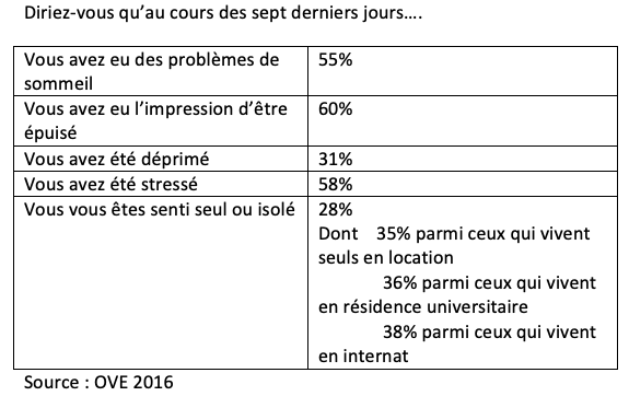 En réalité, il n’est pas difficile d’imaginer les conséquences graves que peut avoir la crise sanitaire sur l’état psychologique et matériel de nombreux étudiants. En effet, les enquêtes de l’Observatoire de la vie étudiante, et notamment la dernière d’entre elles en 2016, mettaient déjà en lumière certaines fragilités de la vie étudiante. Ces fragilités étaient notamment perceptibles sur le plan psychologique et leur ampleur avait surpris les analystes de l’enquête. Le petit tableau ci-dessous en donne un recensement.