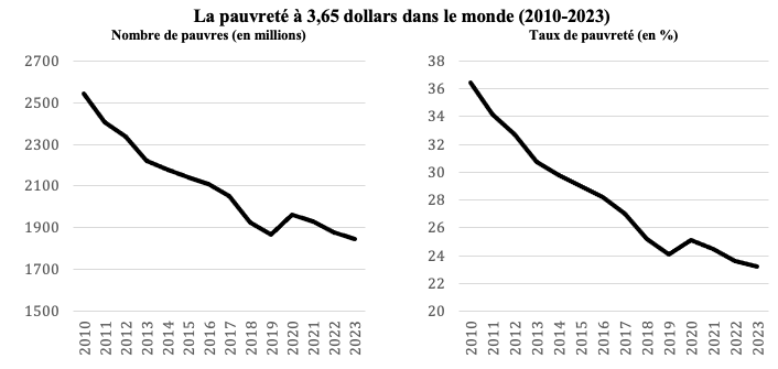 Avec le nouveau trio d’indicateurs, on peut noter que la pauvreté, telle que traditionnellement mesurée depuis des décennies, tournerait en 2023 autour de 9%, bien en deçà des 10% pré-covid. Avec l’indicateur intermédiaire (à 3,65 dollars), la pauvreté est passée, depuis 2010, du tiers de la population mondiale au quart ! Mais avec l’indicateur haut (à 6,85 dollars), on repère que c’est presque la moitié de la population mondiale qui peut être dite pauvre.