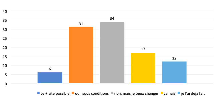 Dans cette course à l’optimisation des conditions de vie, l’idée de devenir indépendant et de « créer sa boîte » figure comme le joker, un choix toujours possible, des projections sur le travail : 12% des répondants l’ont déjà fait, ce qui correspond à une variable assez commune ; par contre 37% sont tentés de le faire : on ignore ce qu’il adviendra, mais le rêve est là.