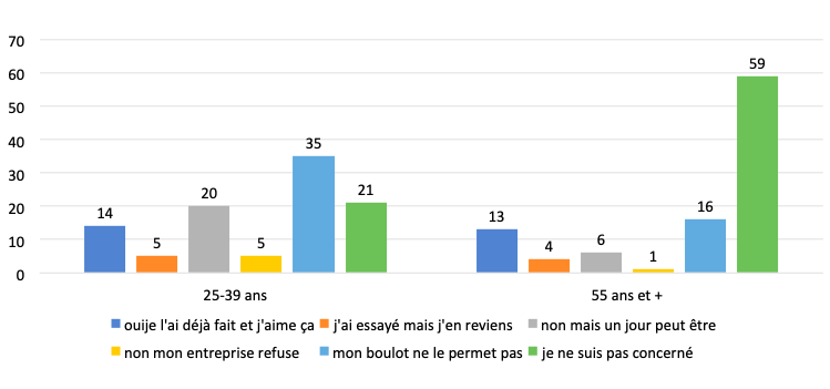 Le réaménagement du lieu de résidence grâce au télétravail concerne 14% des 25-34 ans, soit une proportion presqu’identique de celle des plus âgés ; en revanche, ce projet (non encore réalisé) est en phase exploratoire pour un trentenaire sur cinq : là encore, un halo de lumière entoure cette perspective d’un réaménagement/déménagement. Ceci correspond à l’air du temps, une image qui est en train de s’imposer dans le registre des projections sur « une autre vie que la mienne », et de surcroît un plan plus facile à réaliser pour certaines professions intellectualisées[5].