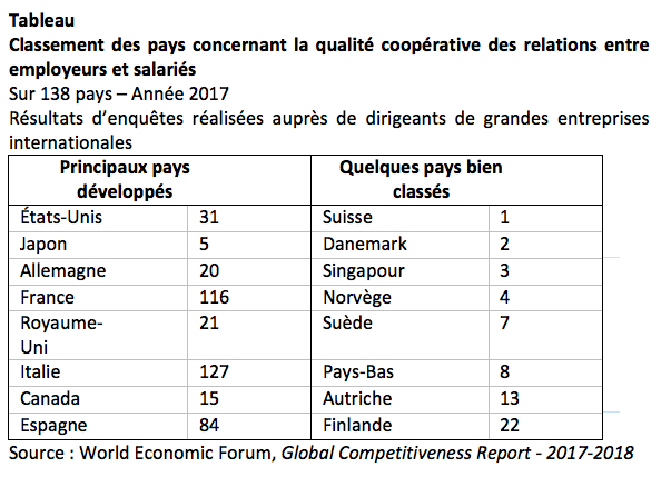 Plusieurs symptômes d’une telle culture de lutte de classes peuvent être évoqués. Tous montrent que, parmi les pays les plus développés, ceux d’Europe du sud pâtissent plus que les autres de cette culture qui peut y rendre plus difficile la mise en œuvre de réformes structurelles. Un premier symptôme est le résultat d’enquêtes réalisées par le World Economic Forum auprès de dirigeants de grandes entreprises internationales concernant la qualité coopérative des relations entre employeurs et salariés. Le rang des pays concernant cette qualité perçue par des dirigeants d’entreprises internationales fournit une indication de la culture coopérative ou conflictuelle des relations entre salariés et employeurs. Sans surprise, les pays d’Europe du sud (France, Italie et Espagne) apparaissent très mal classés, ce qui témoigne d’une forte prégnance d’une culture de lutte de classes (Tableau). À l’inverse, les pays nordiques et scandinaves (Danemark, Norvège, Suède et Finlande) ainsi que, en Europe, la Suisse, l’Autriche et l’Allemagne et hors de l’Europe Singapour, le Japon et les pays anglo-saxons (Canada, Royaume-Uni et États-Unis) sont bien classés.