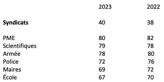 Comme toute démocratie, la démocratie sociale repose d’abord sur la confiance. Or sur ce plan, le constat fait par de nombreuses enquêtes est sans appel. En 2023, suite au mouvement sur les retraites, le niveau de confiance que les salariés accordaient aux syndicats est de 40%. Ce niveau de confiance est absolument identique à celui que l’on constatait en 2021. Or il s’agit d’une confiance très relative et minoritaire puisque le taux de défiance des salariés est de 60%[5]. D’un point de vue plus général et comparatif, les syndicats demeurent année après année en « queue de peloton » des classements concernant la confiance des Français ou des salariés à l’égard des institutions ou des acteurs (tableaux ci-dessous). Il s’agit là d’une situation critique que le syndicalisme partage avec les médias, les partis politiques et les réseaux sociaux, c’est-à-dire les « mal-aimés » de ce type de classement[6].