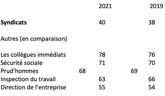 [5]. Dans le second tableau, on observe que la hausse du taux de confiance est entre 2019 et 2021, identique à celle que l’on constate dans l’enquête « Fractures françaises » faite en octobre dernier. En 2021, période du confinement lié à la Covid, on estimait que ce regain de confiance était dû au rôle des syndicats qui en lien avec les directions, s’attachaient à assurer au mieux le maintien de l’activité et la protection sanitaire des salariés qui restaient présents dans les entreprises.