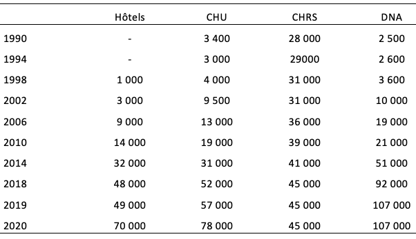 Si l’on se penche, plus précisément, sur les sans-domicile alors les chiffres ont plus augmenté encore. Pour les demandeurs d’asile, relevant du dispositif national d’accueil (DNA), l’offre a été multiplié par 40 en 30 ans (2 500 places en 1990, plus de 100 000 en 2020). Pour héberger des sans domicile en hôtels, l’offre a été multiplié par 70 en moins de 25 ans (1 000 places en 1998, 70 000 en 2020). Soulignons que la période COVID aura été très singulière, accélérant les créations de places. En 2020, 43 000 places ont été ajoutées (pour moitié en centres d’urgence, pour moitié en hôtels), avec 0,7 milliard d’euros de dépenses publiques complémentaires.
