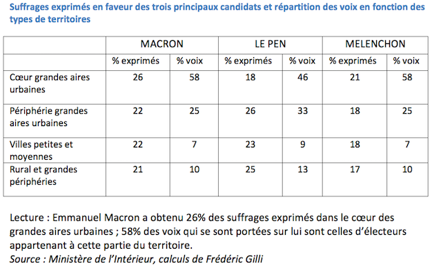 La note de Terra Nova citée plus haut ne valide pas non plus la partie « politique » de la thèse des deux France, c’est-à-dire l’idée sous-jacente, dans les thèses de Guilluy, d’une forte corrélation entre le clivage territorial et le clivage électoral. En prenant appui sur les résultats électoraux du premier tour de l’élection présidentielle de 2017, l’étude montre que les voix des électeurs des trois principaux candidats (Macron, Le Pen, Mélenchon) se répartissent relativement harmonieusement.