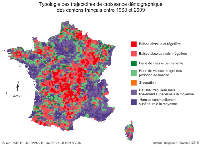 Reconnaissons tout d’abord que d’un strict point de vue démographique l’idée qu’une grande partie des territoires de faible densité et en déclin démographique se trouve bien sur cette fameuse diagonale est assez largement vérifiée. La carte ci-dessous, extraite d’un article de Sébastien Oliveau et Yoann Doignon, l’illustre bien.